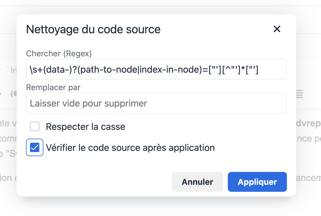Le plugin a été conçu pour éviter les résidus courants. Lorsqu'un attribut est supprimé, advreplace nettoie automatiquement les doubles espaces créés, garantissant ainsi une balise HTML parfaitement formée et valide.